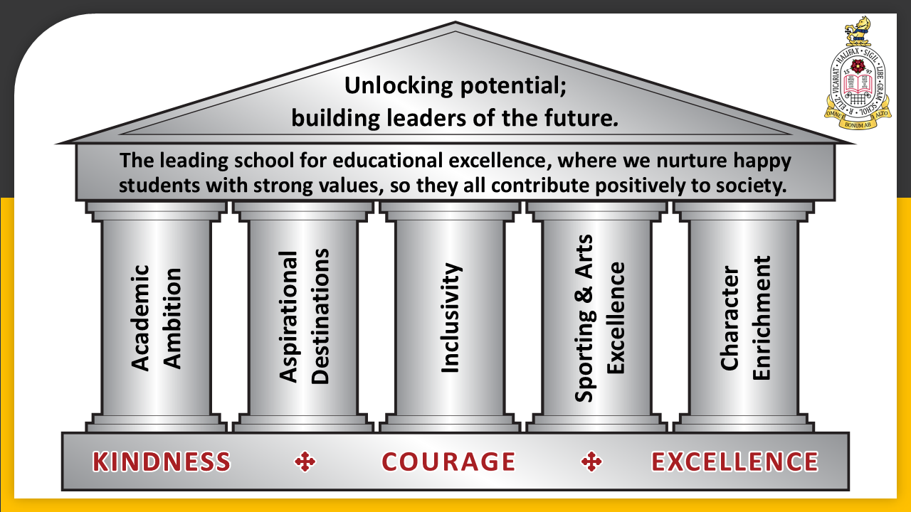 We are an inclusive school family, pursuing our vision to be “The leading school for educational excellence, where we nurture happy students with strong values, so they all contribute positively to society”. Our values are kindness, courage and excellence. Kindness means we respect each other and show generous hearts. Through courage we dare to make a difference. Excellence is achieved as we strive for success. Our mission is to unlock potential and build leaders of the future.