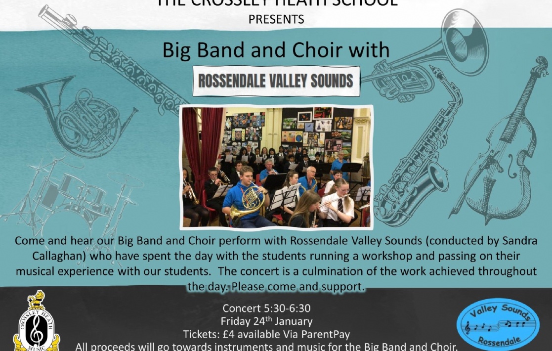 Come and hear our Big Band and Choir perform with Rossendale Valley Sounds (conducted by Sandra Callaghan) who have spent the day with the students running a workshop and passing on their musical experience with our students.  The concert is a culmination of the work achieved throughout the day.  Please come and support.