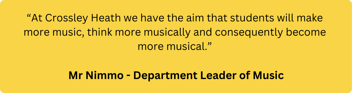 Some of these groups require students to have prior experience of different instrument i.e. Crossley Brass, Big Band and Guitar Club but others such as Music Theory and Choir are available to all.  We strongly believe in an inclusive enriched curriculum and each group is available across all year groups.  This provides younger students with role-models and mentors to work with through their musical journey.