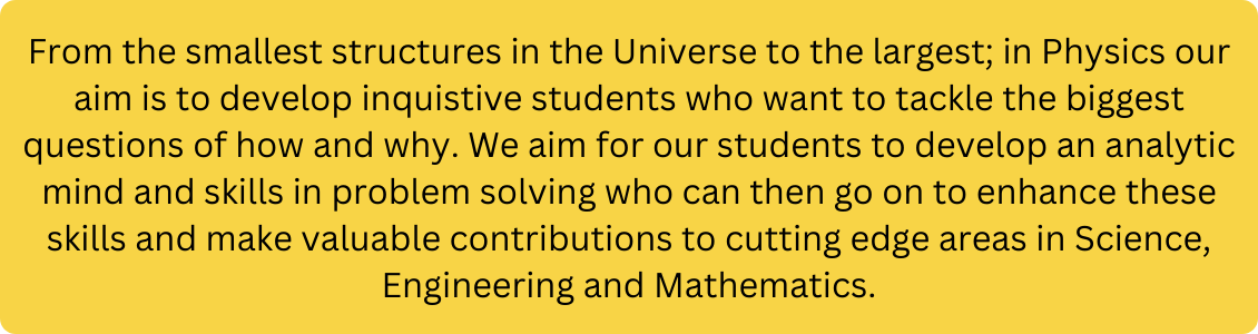 Our Physics curriculum develops scientific skills such as questioning, analytical and problem-solving skills. Practical work underpins many of the topics studied at GCSE and Advanced level. Our students come from a wide range of backgrounds and learn to respect each other and their differing experiences. We expect our students to help each other, supporting their class mates to achieve their aspirations.