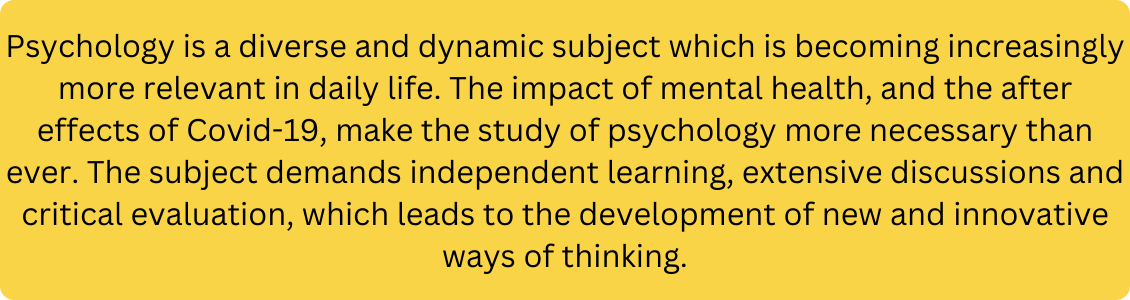 Psychology is a diverse and dynamic subject which is becoming increasingly more relevant in daily life. The impact of mental health, and the after effects of Covid-19, make the study of psychology more necessary than ever. Eating disorders are up by a third in teenagers as a consequence of isolation, in addition to a range of other problems stemming from the increasing cost of living. Historic gender stereotypes are now being questioned with students identifying outside these labels. Psychology acts as a platform for discussing and allowing people to get a better understanding of some of the topics that ordinarily may not be addressed.