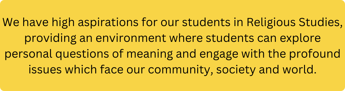 We foster curiosity, debate and reasoned argument and help our students understand the place of religion and non-religious beliefs, in the modern world. Our students come from a wide range of primary schools, cultures, religious and non-religious backgrounds, we aim to ensure all students recognise and understand that ‘difference is good’, whilst gaining the knowledge necessary for sustained progress throughout years 7-13.